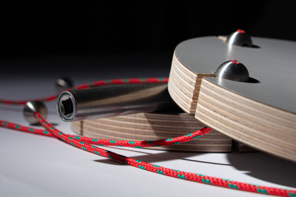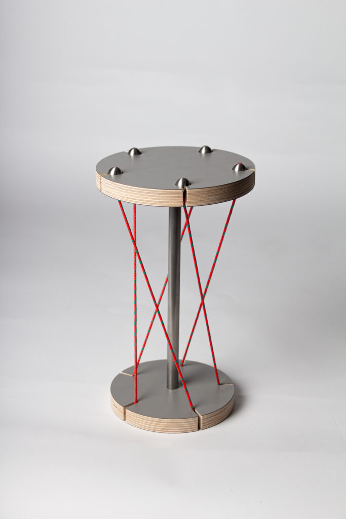 Der Hocker basiert auf einem spannungsgesteuerten Verbindungsprinzip. Sitz- und Fußfläche sind über seitlich geführte Seile miteinander verbunden, die am Rand der beiden Scheiben befestigt sind. Durch das gezielte Verdrehen von Sitz- und Fußelement gegeneinander werden die Seile gespannt.