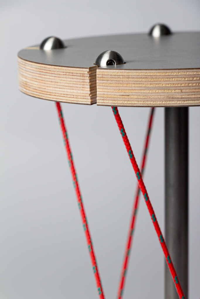 Mit zunehmender Drehung erhöht sich die Zugspannung, wodurch sich die Konstruktion stabilisiert. Die Seile übernehmen dabei die tragende Funktion und verleihen dem Hocker seine strukturelle Festigkeit.